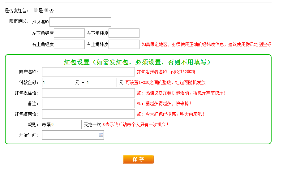 在用户中心进入投票项目列表,点击投票设置内的编辑,进入投票项目的编辑窗口,在这里可以设置投票项目发红包,【是否发红包】,可以设置用户投票后,给用户发红包。为选填项,选择否,则不发红包。选择是,发红包,可以设置活动参加地区,限定当地或者某一地区参加,如需限定地区,必须使用正确的经纬度信息,建议使用腾讯地图坐标。